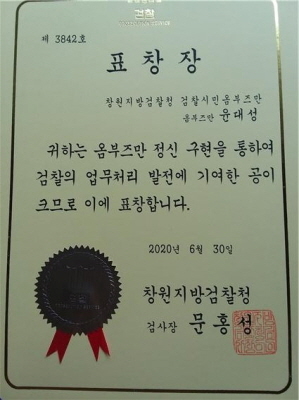 창원대 윤대성 교수, 창원지검 ‘옴부즈만 정신 구현 공로’ 표창