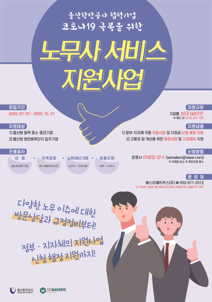 울산항만공사(이하 UPA)는 코로나19에 따른 울산항 기업들의 고용안정을 지원하고 노동 환경 변화에 대응하고자 ‘노무사 서비스 지원사업’을 실시한다고 밝혔다.