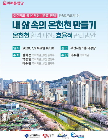 이번 토론회는 지난 4.15 총선에서 온천천 환경개선을 통한 쾌적한 생활 환경 조성을 위해 연제구, 동래구, 금정구 3개 지역 후보가 공통 공약을 발표한 이후 처음 열리는 행사다.