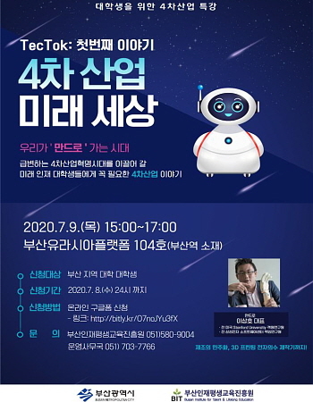 첫 특강으로 오는 9일 오후 3시 부산역 유라시아플랫폼 104호에서 3D프린팅 기반 전자의수 제작 스타트업 ‘만드로㈜’의 이상호 대표를 초청해 4차 산업에 대한 이야기를 들어볼 예정이다.