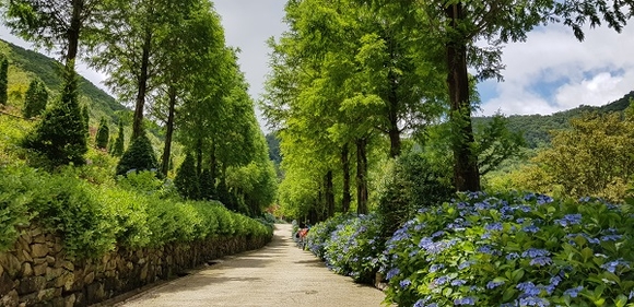 고성군 동해면에 위치한 만화방초는 수국과 꽃무릇 등 30종의 식물이 다양한 볼거리를 연출하고 있으며, 올해 3회째 수국전시회를 열고 있다.