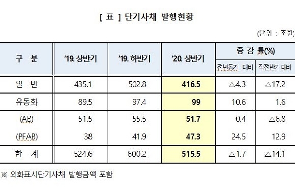 올 상반기 단기사채(STB)를 통한 자금조달 규모가 총 515조 5000억원을 기록한 것으로 나타났다.