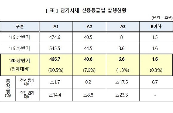 신용등급별로는 A1이 466조 7000억원으로 가장 큰 비중을 차지했고 이어 A2(40조 6000억원), A3(6조 6000억원) 등의 순으로 신용등급이 낮을수록 발행량이 감소했다.