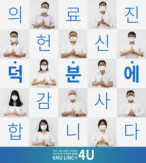 국립 경상대학교(GNU) 링크플러스(LINC+) 사업단은 지난 7일 오후 코로나19 감염 치료와 확산 예방을 위해 의료 최전선에서 헌신하는 전국 의료진에게 감사와 응원의 메시지를 전달하는 ‘덕분에 챌린지’ 캠페인에 동참했다. 지난 2일 경남대 링크플러스사업단의 지목을 받아 진행했다.