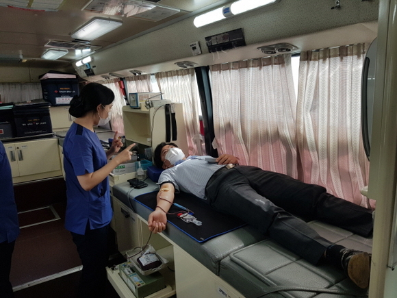 한국남동발전이 8일 진주 본사에서 코로나19 장기화로 인한 전국적인 혈액부족사태 극복에 동참하기 위해 헌혈행사를 진행했다. (사진=남동발전 제공)