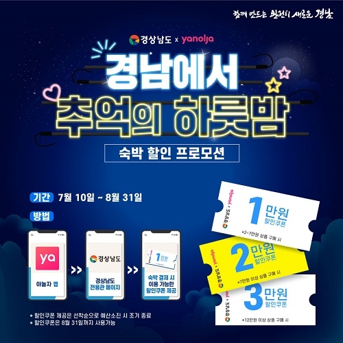 지난 6월 공모를 통해 국내 유명 온라인 여가 플랫폼 ‘㈜야놀자’를 프로모션 운영사로 선정함에 따라, 경남도는 야놀자 앱을 통한 '경남도 전용관 페이지'에서 숙박 예약과 결제 시 이용 가능한 할인쿠폰을 제공한다.