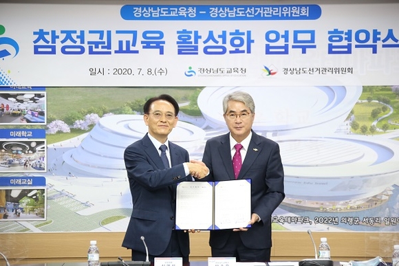 경남도교육청은 8일 오전 도교육청 중회의실에서 경남선거관리위원회와 '미래유권자인 학생 및 청소년의 참정권교육 활성화'를 위한 업무협약(MOU)을 체결했다.