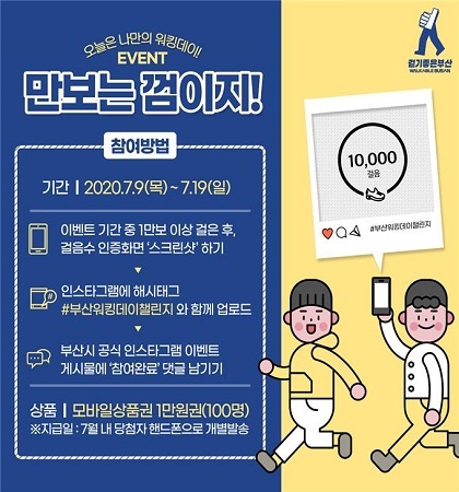 시에 따르면 이번 이벤트는 시가 매달 추진하고 있는 워킹데이의 7월 이벤트로 시민의 생활 속 걷기 실천의 참여를 이끌고자 마련됐다. 행사는 시민 누구나 1만보 걸음 수를 SNS에 인증하면 참여할 수 있다.