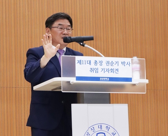 권순기 신임 총장은 9일 오후 2시 경상대 박물관 및 고문헌도서관 1층 기자회견장에서 취임 후 첫 공식 기자회견을 열어 '우수 인재를 양성하는 글로컬(Glocal) 대학, 지역 협력을 선도하는 거점(Networked) 대학, 원칙과 소통이 살아 있는 통합(United)대학' 등 대학 경영 목표를 제시했다.