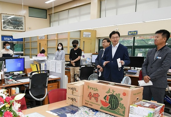 김 지사는 내서읍 행정복지센터 직원들에게 감사의 마음을 담은 서한문과 함께 도내 사회적농업협동조합을 통해 구매한 과일꾸러미를 전달하고 환담을 나눴다. 이 과정에서 김 지사는 39명의 직원들이 한 개 군(郡) 인구 수준인 6만5천여 명의 행정업무를 차질 없이 해냈다는 것에 감탄하며 격려하기도 했다.