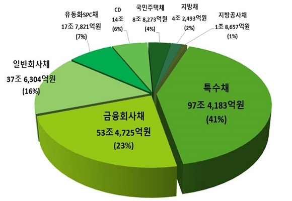 종류별로 보면 특수채가 41.0%로 가장 큰 비중을 차지했다. 이어 금융회사채(23.0%), 일반회사채(16.0%), SPC채(7.0%), CD(6.0%), 국민주택채(4.0%), 지방채(2.0%) 등의 순으로 많았다.