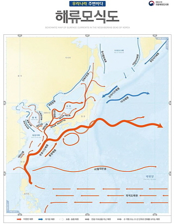해류모식도는 복잡한 바닷물의 흐름을 간단하고 쉽게 표현한 지도로 동해 바닷물이 어디서 흘러왔는지 한눈에 볼 수 있다.