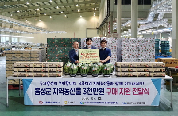 한국동서발전은 코로나19로 어려움을 겪고 있는 음성군 지역농가의 판로를 지원하기 위해 지역 대표 농산물인 ‘다올찬수박’과 ‘햇사레복숭아’를 구매해 지역 경제 활성화를 돕는다.