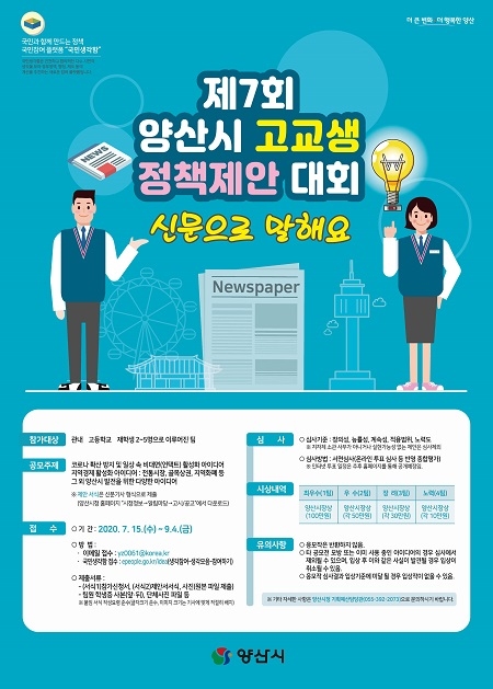 양산의 미래를 이끌 고등학생들의 시정에 대한 관심을 높이고, 학생 특유의 참신하고 독특한 아이디어를 발굴하기 위해 양산시가 제7회 양산시 고교생 정책제안대회 '신문으로 말해요'를 진행한다.