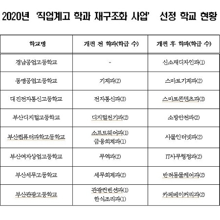 개편되는 고교와 학과는 ▲부산컴퓨터과학고 소프트웨어과 및 금융회계과, ‘사물인터넷과’ 통합개편 ▲부산관광고 관광컨벤션과 및 한식조리과, ‘카페베이커리과’ 통합개편 ▲동명공고 기계과, ‘스마트기계과’ ▲대진전자통신고 전자통신과, ‘스마트콘텐츠과’ ▲부산여상 무역과, ‘IT사무행정과’ ▲부산디지털고 디지털전기과, ‘소방안전과’ ▲부산세무고 세무회계과, ‘반려동물케어과’로 각각 시행한다.