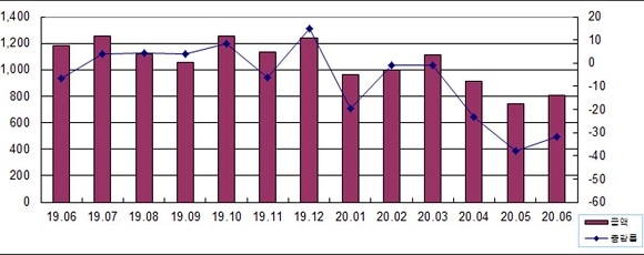 최근 중국 수출 증감률은 지난 2월 –8.7%, 3월 23.1%, 4월 0.1%로 회복세를 띄다 5월 –2.7%, 6월 –25.5%를 기록하고 있다.