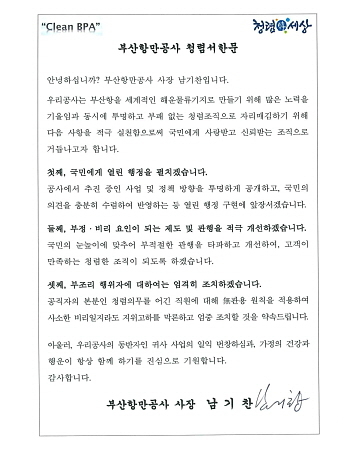 남기찬 BPA 사장 명의의 서한문은 부산항을 세계적 해운물류기지로 만들기 위해 투명하고 부패 없는 청렴 조직으로 자리매김해 신뢰받는 글로벌 항만기업이 되겠다는 메시지가 담겼다.
