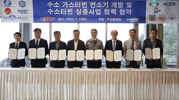 두산중공업은 경남 창원본사 게스트하우스에서 한국기계연구원과 경남테크노파크, 한국지역난방공사 등 13개 산·학·연 관계자들이 참석한 가운데 '수소 가스터빈 연소기 개발 및 수소터빈 실증사업화 협력' MOU를 체결했다고 15일 밝혔다.