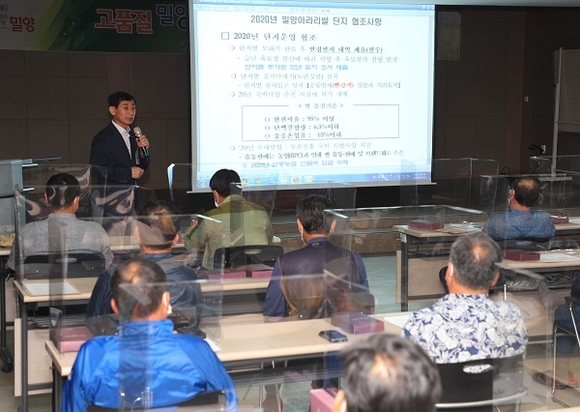 경남 밀양시는 15일 농업기술센터 대회의실에서 고품질 '밀양아라리쌀' 생산단지 운영을 위한 단지농업인 교육을 실시했다.
