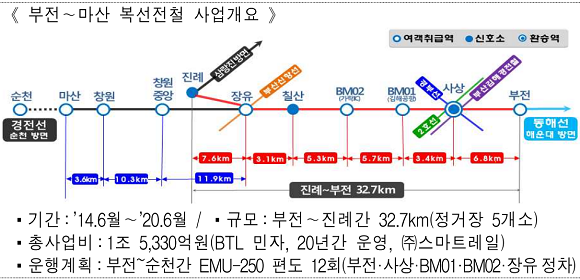 부전-마산 복선전철 개통사업은 부산 부전역과 창원 마산역 사이 9개역 총 50.3㎞의 복선전철을 운행하는 사업으로 내년 상반기 개통을 앞두고 있다.