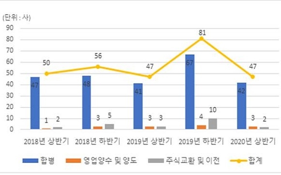 사유별로는 영업 양수·양도는 전년 상반기와 수가 같으며 합병이 1개사 더 늘었다. 또 주식교환 및 이전은 1개사 감소한 것으로 조사됐다.