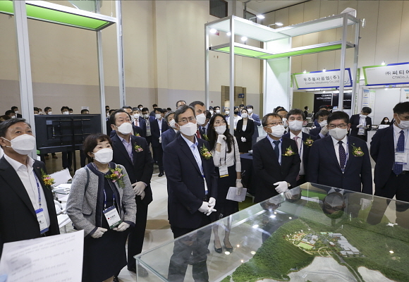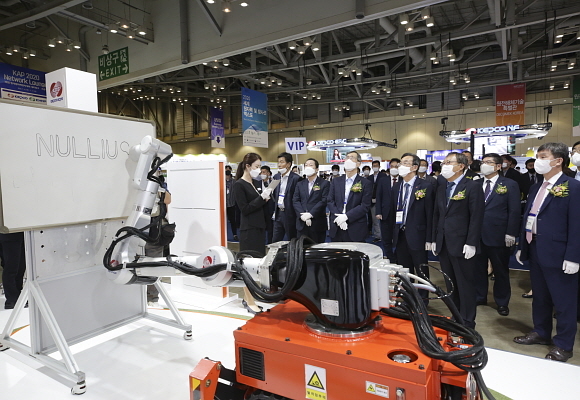 지난 16일 벡스코 제1전시장에서 ‘2020 부산국제원자력산업전’이 열린 가운데 한국원자력산업협회, 과학기술정보통신부를 비롯한 정부 부처 관계자들이 전시장을 둘러보고 있다.