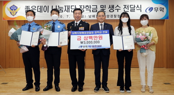 무학 좋은데이나눔재단은 17일 여름철 휴양객의 안전과 해양사고 예방을 위해 노력하는 해양경찰에게 감사를 전하고자 남해지방해양경찰청에 위문품과 자녀 장학금 300만원을 전달했다.