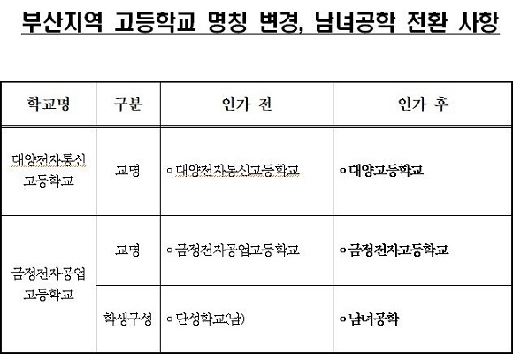 부산 남구 문현동에 위치한 대양전자통신고는 대양고로, 금정구 서동에 위치한 금정전자공고는 금정전자고로 교명을 각각 변경한다. 또 금정전자공고는 기존 남자 단성학교에서 남녀공학으로 전환된다.