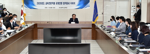 이날 유치원과 초등학교, 중학교 등 교육전문직원 임용후보자 공개전형 합격자 27명이 김 교육감에게 합격통지서를 받았다.