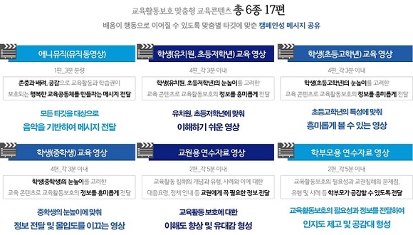 이번에 제작할 맞춤형 교육콘텐츠는 교육공동체의 교육활동 보호에 대한 이해와 공감대 형성을 위한 예방 교육자료로 활용할 수 있는 2-3분 분량의 짧은 동영상 자료로, 뮤직동영상 1종과 학생교육용 3종, 교원연수용 1종, 학부모교육용 1종 등 총 6종 17편을 제작한다.