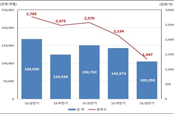 발행 형태별로는 사모발행이 7조 2558억원으로 전체 발행금액의 68.9%를 차지했다. 이는 전년동기대비 37.9%(4조 4376억원), 직전반기대비 24.4%(2조 3425억원) 각각 감소한 수치다.
