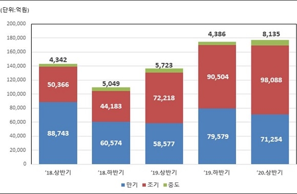 상환 유형별로는 조기상환이 9조 8088억원으로 가장 많은 전체의 55.3%의 비중을 차지했다. 이어 만기상환이 40.1%(7조 1254억원), 중도상환이 8315억원(4.6%)을 차지했다.