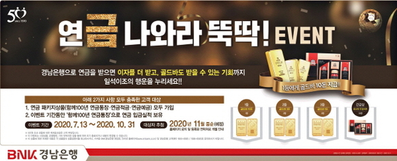 BNK경남은행은 함께100년 연금 패키지 상품 출시를 기념해 오는 10월 말까지 ‘연금(金) 나와라 뚝딱 이벤트’를 진행 중이라고 22일 밝혔다.