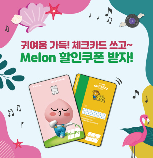 이벤트 대상은 라이언 치즈, 어피치 스윗 체크카드(유니온페이)를 소지한 회원이며, 10만원 이상 해당카드 이용 후 이벤트에 응모한 고객이 대상이다. 추첨을 통해 ‘멜론 할인쿠폰’을 1,000명에게 제공한다.