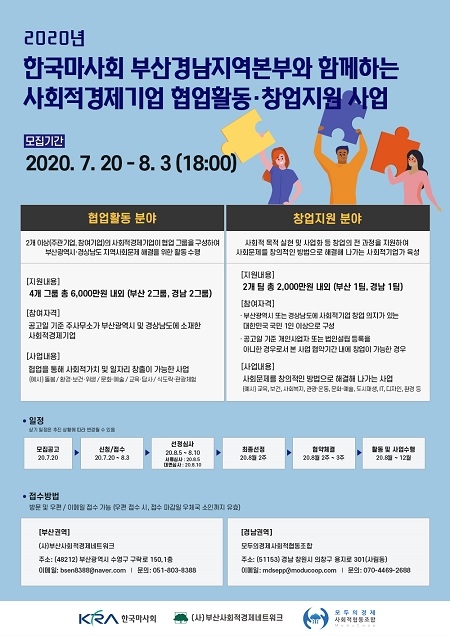 한국마사회 부산경남지역본부는 부산 및 경남지역을 대상으로 사회적경제기업 지원을 위한 공모사업을 추진한다고 23일 밝혔다.