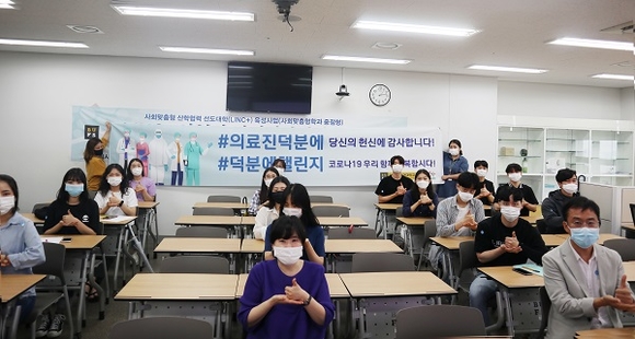 권선희 LINC+사업단장은 “코로나19 사태가 장기화 되면서 오랜 시간 애쓰고 있는 의료진 및 방역관계자에게 응원 마음을 전달하고자 LINC+사업 관계자분들과 학생들이 모두 챌린지에 참여했다”며 “현장 일선에서 최선을 다하시는 많은 분들에게 응윈의 메시지가 전달되어 조금이나마 마음의 힘이 되길 바란다”고 밝혔다.