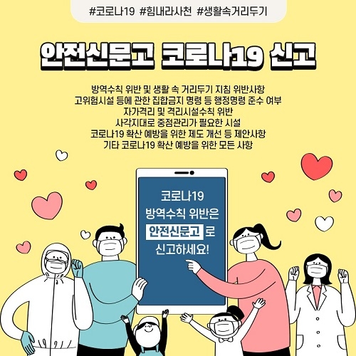 안전신고 대상은 ▲집합금지 조치를 한 시설에서 영업이나 모임을 하는 경우 ▲자가격리 무단이탈자 ▲방역지침이 반복·복합적으로 지켜지지 않는 경우 ▲특정한 시설, 사업장, 영업, 집회·모임, 행위 등으로 감염확산 위험이 높은 경우 ▲코로나 19 확산 예방을 위한 제도 개선 등 제안 사항이다.
