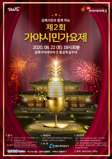 이번 가요제는 비대면 영상평가를 거쳐 8월 22일 오후 6시 30분 가야테마파크 태극전 특설무대에서 김해 최고의 가수왕을 가린다.