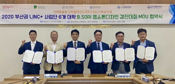 한국해양대 LINC+사업단은 29일 오후 동아대학교 승학캠퍼스 본부 대회의실에서 부산권 LINC+사업단 5개 대학(동명대·동서대·동아대·동의대·부경대)과 ‘지역사회 문제해결을 위한 민·관·산·학 협력 캡스톤디자인 프로젝트 B.SORI 공동추진을 위한 협약’을 체결했다.