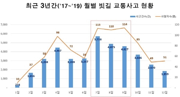 장마 및 폭우를 대비해, 와이퍼·타이어·에어컨 등도 점검을 해야 한다. 최근 3년간(2017~2019) 빗길 교통사고 중 약 38%(15,228건)가 장마철인 7월에서 9월 사이에 발생했고, 우천 시 교통사고 치사율이 맑은 날 보다 약 35% 높게 나타났다.