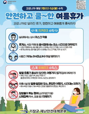 부산시 기장군이 본격적인 여름 휴가철을 맞아 코로나19 감염병의 지역사회 확산 차단을 위해 ‘코로나19 예방 여름철 행동수칙’을 집중 홍보할 계획이라고 5일 밝혔다.