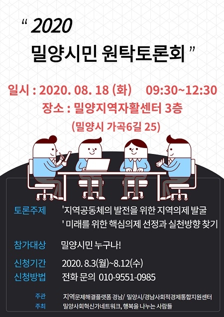 한편 2020 밀양시민 원탁토론회 참여는 오는 12일까지 밀양사회혁신가네트워크로 신청하면 된다.