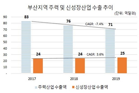 실제 지난해 부산에서 신성장산업에 속한 품목군의 수출실적은 25억 달러로 집계됐다. 이는 126억 달러를 기록한 서울의 5분의 1 수준이며 112억 달러인 인천과 비교해도 4분의 1 수준이다.
