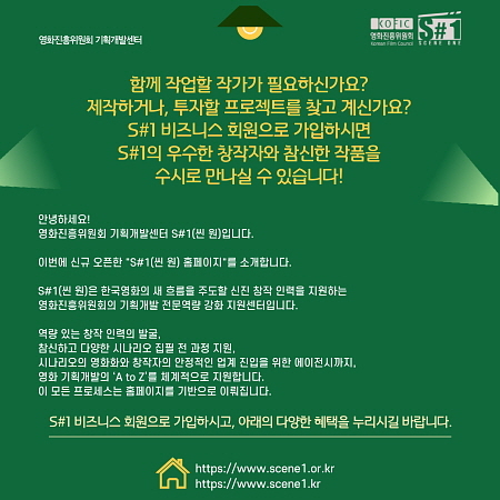 영화진흥위원회(영진위)가 이달부터 한국영화 기획개발 전문 역량 강화 지원센터인 ‘S#1(씬원)’의 홈페이지를 오픈하고 각종 서비스를 시작한다고 6일 안내했다.