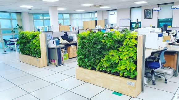 양산시 농업기술센터는 공모 선정을 통해 확보한 국비 등 총사업비 5천만원을 투입, 시민 방문이 잦은 시청 종합민원실과 농업기술센터(로비 및 사무공간) 2곳에 입면녹화(수직정원), 식물조경 등 실내그린인테리어를 이용한 그린힐링오피스 사업을 완료해 시민들과 직원들에게 자연 친화적인 쾌적한 환경을 제공하고 있다.