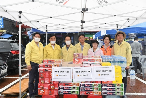화개장터 수해복구 현장을 찾은 김하용 의장 일행은 하동군 건설소방국장으로부터 피해 상황을 청취하고 신속한 복구를 당부했다. 이어서 피해 복구에 한창인 소방서, 군부대 및 적십자 등 자원봉사자 분들을 격려하면서 컵라면, 생수 등 현장 복구작업에 필요한 물품을 전달했다.