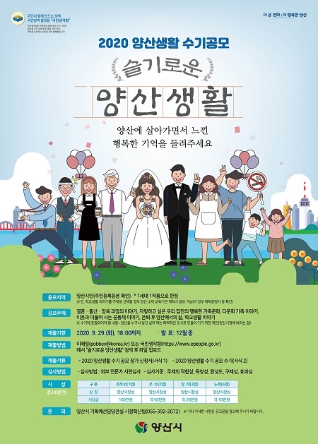 경남 양산시는 결혼·출산·양육, 행복한 가족문화, 다문화 가족 등 다양한 생활 속에서 시민 중심의 시책을 발굴·시행하기 위해 2020 양산생활 수기 '슬기로운 양산생활' 공모를 실시한다고 11일 밝혔다.