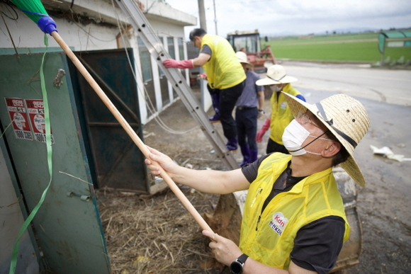 이날 박 사장과 직원들은 마스크와 장화를 착용하고 갑작스러운 폭우로 피해를 입은 마을 복구 작업에 힘을 보탰다. 직원들은 침수 주택 가구청소, 토사물 제거, 쓰레기 수거 작업 등에 나섰다.