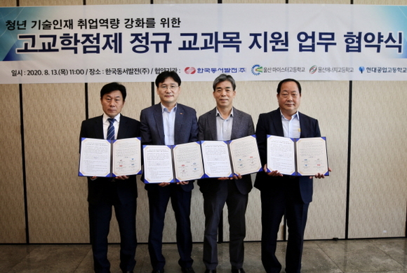 동서발전은 13일 울산 마이스터고, 울산 에너지고, 현대공고 3개교와 울산 교육청 관계자가 참석한 가운데 ‘코로나 극복, 청년 기술인재 취업역량 강화를 위한 고교학점제 정규 교과목 지원 협약’을 체결했다.