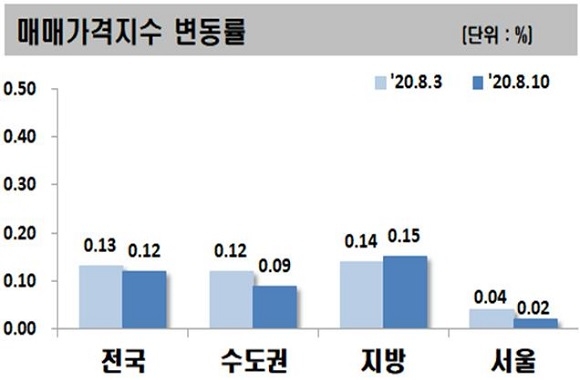 세부적으로 수도권 중 서울은 0.02% 상승했으며 인천은 0.02% 상승, 경기는 0.15% 상승했다. 지방의 경우 5대 광역시는 0.14% 상승했으며 기타 8개 도는 0.07% 상승, 세종시는 2.48% 상승했다.